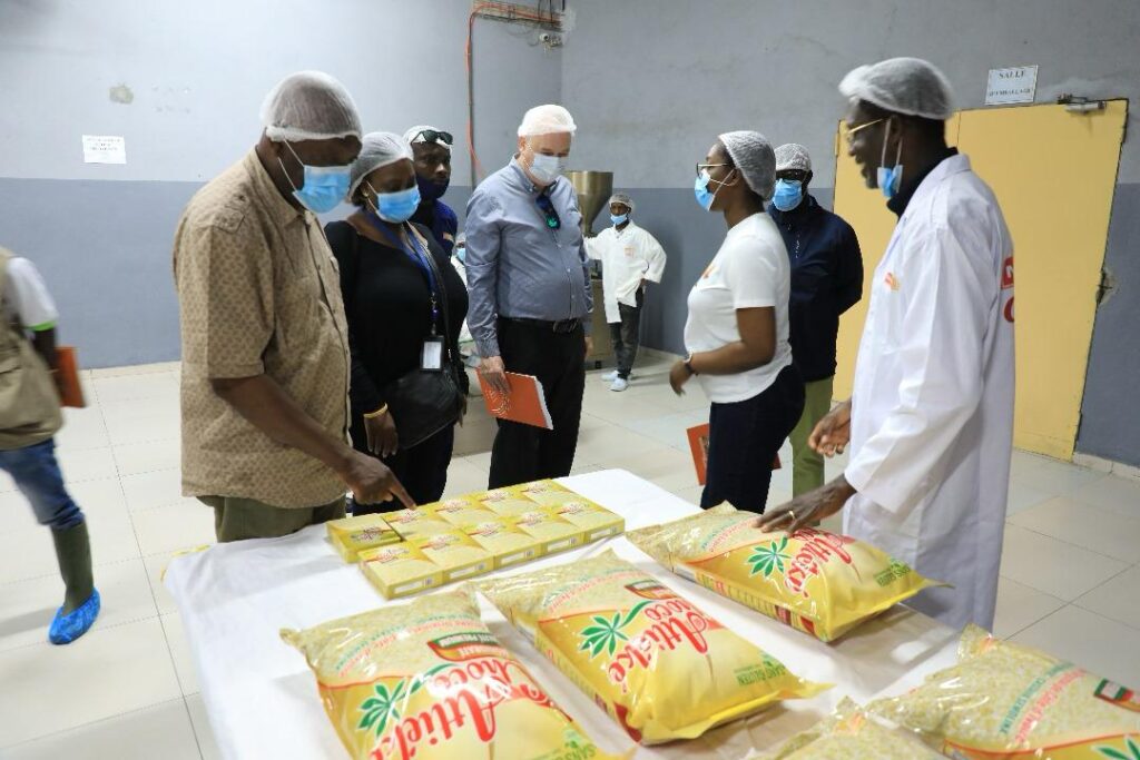 Au cours de cette mission, trois localités ont été visitées, chacune illustrant un maillon essentiel du développement agro-industriel local. À Alepé, la délégation a découvert Nourivoire, unité moderne de production d’attiéké « Attiéké Choco », dirigée par KRE Maxime. Bénéficiaire du guichet B de la première cohorte du FCP, l’entreprise produit aujourd’hui 250 tonnes d’attiéké destinées au marché local et à l’export.