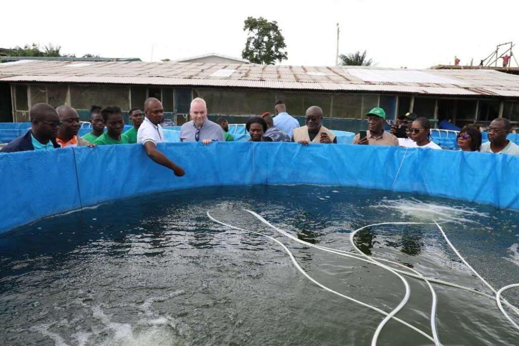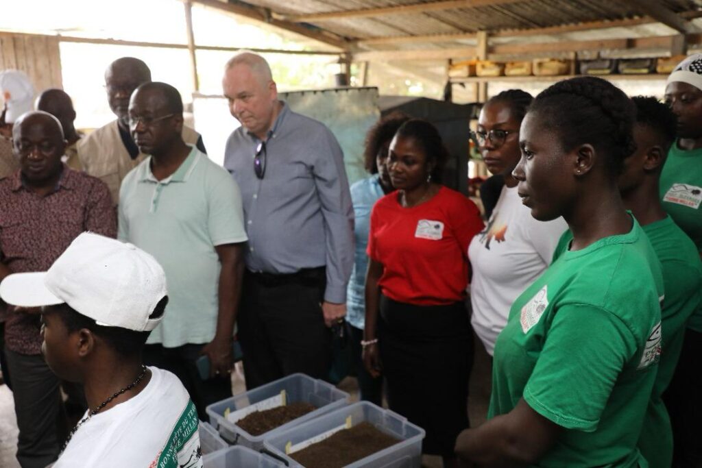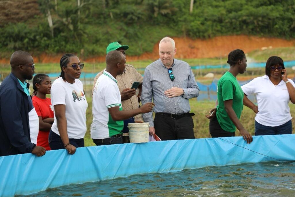 A Aboisso, la délégation s’est rendue sur le site de Poly Élevage, entreprise de Augustin MILLAN, spécialisée dans la production d’alevins et d’aliments pour poissons à base de mouches soldats noires. L’exploitation, qui assure également le grossissement des poissons et des formations spécialisées, dispose aujourd’hui de 10 bacs hors sol, de 15 étangs (dont 10 réhabilités et 5 nouvellement construits) et d’une retenue d’eau.